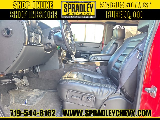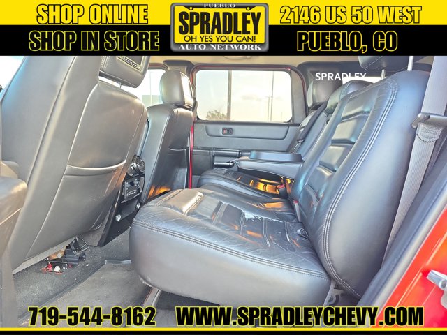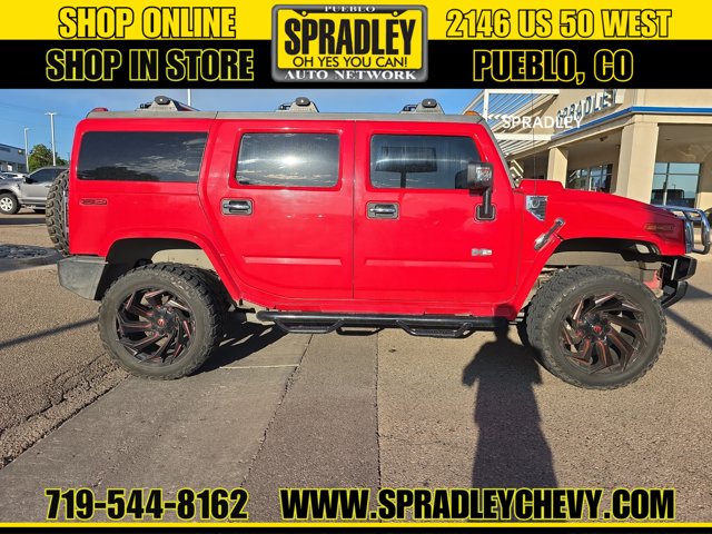 This hummer h2 delivers a Gas V8 6.0L/366 engine powering this Automatic transmission. Wiring provisions, auxiliary front lighting, Wipers, front intermittent wet-arm with pulse washers, Windows, power with driver and global Express-Down.* This hummer h2 Features the Following Options *Wheels, 5 - 17 x 8.5 (43.2 cm x 21.6 cm) aluminum (Upgradeable to (P44) 5 - 17 x 8.5 (43.2 cm x 21.6 cm) chrome aluminum wheels.), Wheel flares, front and rear, black, Visors, driver and front passenger, padded with cloth trim, extenders and secondary shades, color-keyed, Universal Home Remote, includes garage door opener, 3-channel programmable, Underbody protection, includes driveline protection, skid plates and rocker protection, Transmission, 4-speed automatic, heavy-duty, electronically controlled, Transfer case, electronic shift, Trailering equipment, heavy-duty, includes front winch receiver provisions, Traction control, single wheel, Tires, LT315/70R17 on/off-road, blackwall.* Stop By Today *For a must-own hummer h2 come see us at Spradley Chevrolet Hyundai, 2146 W Us Highway 50, Pueblo, CO 81008. Just minutes away!