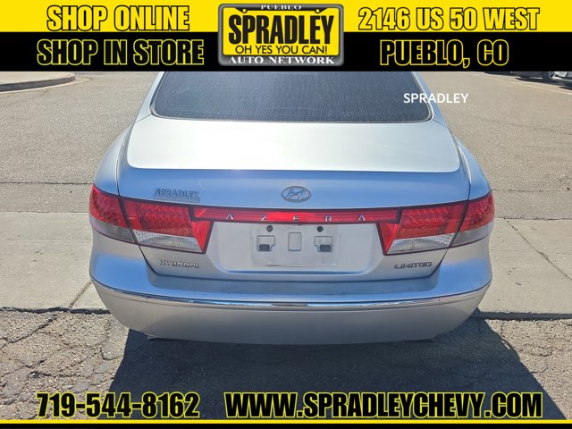 Silver Frost Metallic 2008 Hyundai Azera Limited FWD 5-Speed Automatic with Shiftronic 3.8L V6 MPI DOHC Variable Intake System Black w/Leather Seating Surfaces.17/26 City/Highway MPGCome in and see why people buy from Spradley Chevrolet Hyundai and then send their friends and family. We pride ourselves on being the best in customer service and giving you the best deal possible. And if you have good credit, bad credit, bankruptcy, or are a first time buyer, we can help! Call Spradley Chevrolet Hyundais Internet Department today at 719-544-8162 and schedule your time to come in and test drive any of our new Chevrolet Silverado 1500, Impala and Suburbans or Hyundai Santa Fe, Tucson and Accents. And dont forget, we have all makes and models of pre-owned to choose from. Located at 2146 HWY 50 West, Pueblo, Colorado, where you will always hear, Oh Yes You Can! Spradley Chevrolet Hyundai, your dealership for all of Southwest, Southeast and Southern, Colorado!
