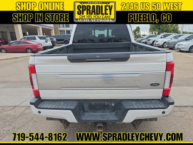 White Platinum Metallic Tri-Coat 2017 Ford F-250SD Platinum 4WD TorqShift 6-Speed Automatic Power Stroke 6.7L V8 DI 32V OHV Turbodiesel 4WD.Odometer is 21250 miles below market average!Come in and see why people buy from Spradley Chevrolet Hyundai and then send their friends and family. We pride ourselves on being the best in customer service and giving you the best deal possible. And if you have good credit, bad credit, bankruptcy, or are a first time buyer, we can help! Call Spradley Chevrolet Hyundais Internet Department today at 719-544-8162 and schedule your time to come in and test drive any of our new Chevrolet Silverado 1500, Impala and Suburbans or Hyundai Santa Fe, Tucson and Accents. And dont forget, we have all makes and models of pre-owned to choose from. Located at 2146 HWY 50 West, Pueblo, Colorado, where you will always hear, Oh Yes You Can! Spradley Chevrolet Hyundai, your dealership for all of Southwest, Southeast and Southern, Colorado!
