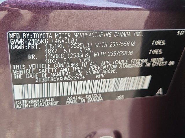 - VIN : 2T3DFREVXHW573424