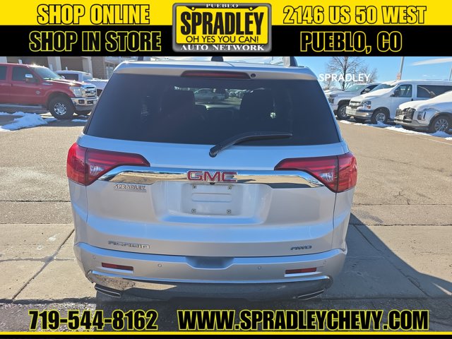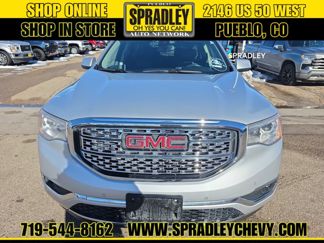 Clean CARFAX. Certified. Quicksilver Metallic 2019 GMC Acadia Denali AWD 6-Speed Automatic 3.6L V6 SIDI AWD, Jet Black w/Perforated Leather-Appointed Seat Trim.Recent Arrival! Odometer is 31357 miles below market average!GM Details:* Powertrain Limited Warranty: 72 Month/100,000 Mile (whichever comes first) from original in-service date* 172 Point Inspection* 24 months/24,000 miles (whichever comes first) Certified Pre-Owned Scheduled Maintenance Plan and 3 days/150 miles (whichever comes first) Vehicle Exchange Program. SiriusXM 3-month trial subscription* Warranty Deductible: $0* Roadside Assistance* Vehicle History* Transferable Warranty* Limited Warranty: 12 Month/12,000 Mile (whichever comes first) from certified purchase dateCome in and see why people buy from Spradley Chevrolet Hyundai and then send their friends and family. We pride ourselves on being the best in customer service and giving you the best deal possible. And if you have good credit, bad credit, bankruptcy, or are a first time buyer, we can help! Call Spradley Chevrolet Hyundais Internet Department today at 719-544-8162 and schedule your time to come in and test drive any of our new Chevrolet Silverado 1500, Impala and Suburbans or Hyundai Santa Fe, Tucson and Accents. And dont forget, we have all makes and models of pre-owned to choose from. Located at 2146 HWY 50 West, Pueblo, Colorado, where you will always hear, Oh Yes You Can! Spradley Chevrolet Hyundai, your dealership for all of Southwest, Southeast and Southern, Colorado!