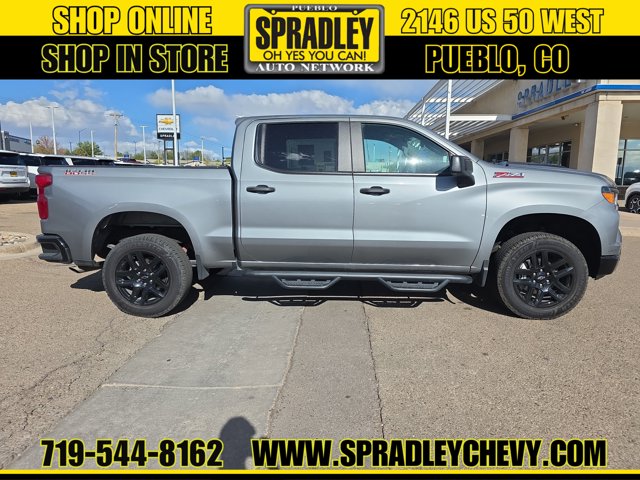 CARFAX One-Owner. Sterling Gray Metallic 2023 Chevrolet Silverado 1500 Custom Trail Boss 4WD 8-Speed Automatic 2.7L Turbo 8-Speed Automatic, 4WD, Jet Black Cloth.Recent Arrival! Odometer is 9469 miles below market average!Come in and see why people buy from Spradley Chevrolet Hyundai and then send their friends and family. We pride ourselves on being the best in customer service and giving you the best deal possible. And if you have good credit, bad credit, bankruptcy, or are a first time buyer, we can help! Call Spradley Chevrolet Hyundais Internet Department today at 719-544-8162 and schedule your time to come in and test drive any of our new Chevrolet Silverado 1500, Impala and Suburbans or Hyundai Santa Fe, Tucson and Accents. And dont forget, we have all makes and models of pre-owned to choose from. Located at 2146 HWY 50 West, Pueblo, Colorado, where you will always hear, Oh Yes You Can! Spradley Chevrolet Hyundai, your dealership for all of Southwest, Southeast and Southern, Colorado!
