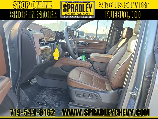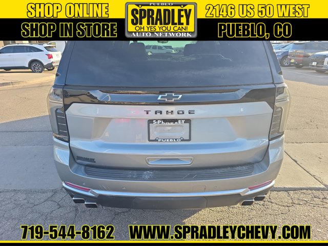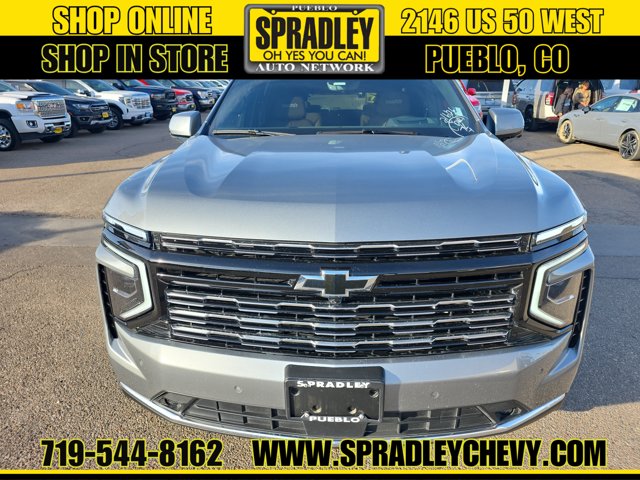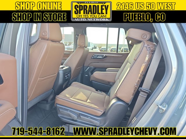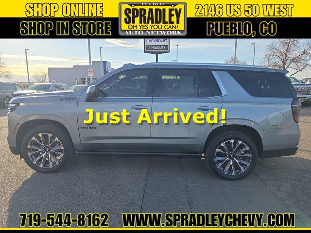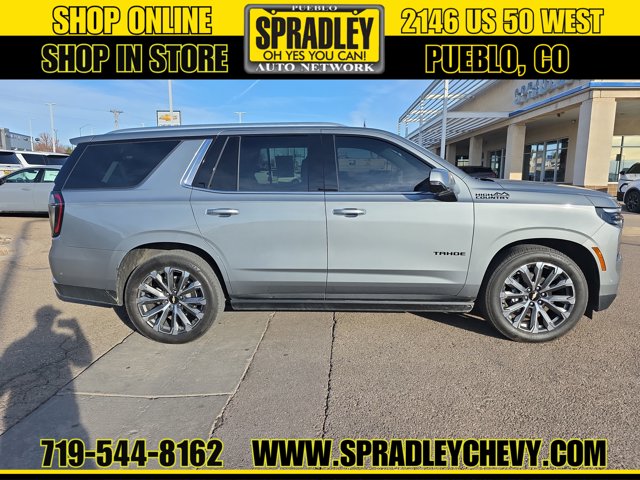 Only 7,657 Miles! This Chevrolet Tahoe boasts a Gas V8 6.2L/ engine powering this Automatic transmission. TRANSMISSION, 10-SPEED AUTOMATIC electronically controlled with overdrive, includes Traction Select System including tow/haul (STD), TRANSFER CASE, ACTIVE, 2-SPEED ELECTRONIC AUTOTRAC with rotary controls, includes neutral position for dinghy towing, TRAILER BRAKE CONTROLLER, INTEGRATED.*This Chevrolet Tahoe Comes Equipped with These Options *MAX TRAILERING PACKAGE includes (ZL6) Advanced Trailering Package, (JL1) trailer brake controller and (V03) extra capacity cooling system Also includes (NQH) 2-speed active transfer case and (JHD) Hill Descent Control on 4WD models., LICENSE PLATE FRONT MOUNTING PACKAGE, HIGH COUNTRY DELUXE includes (C3U) Panoramic power sunroof, (B3L) power-retractable assist steps with perimeter lighting, (F47) Air Ride Adaptive suspension and (NHT) Max Trailering Package, ADVANCED TRAILERING PACKAGE includes (UKW) Blind Zone Steering Assist with Trailering, (PZ8) Hitch View and (UET) Smart Trailer Integration Indicator , TIRES, 275/50R22SL ALL-SEASON, BLACKWALL (STD), SUSPENSION, MAGNETIC RIDE CONTROL, SUSPENSION, AIR RIDE ADAPTIVE, SUNROOF, POWER PANORAMIC, DUAL-PANE, TILT-SLIDING with express-open and close and power sunshade, STERLING GRAY METALLIC, SMART TRAILER INTEGRATION INDICATOR.* Visit Us Today *Come in for a quick visit at Spradley Chevrolet Hyundai, 2146 W Us Highway 50, Pueblo, CO 81008 to claim your Chevrolet Tahoe!